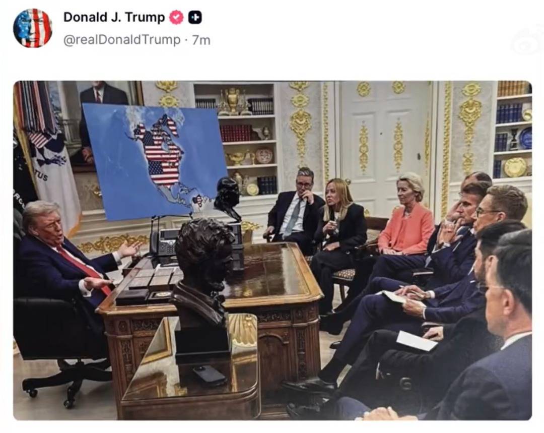 特朗普当天还发布了另一张图片:他在白宫办公室与欧洲领导人会面,后面展板上的地图中,除美国本土外,加拿大、格陵兰岛和委内瑞拉均被美国国旗覆盖。
