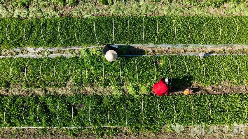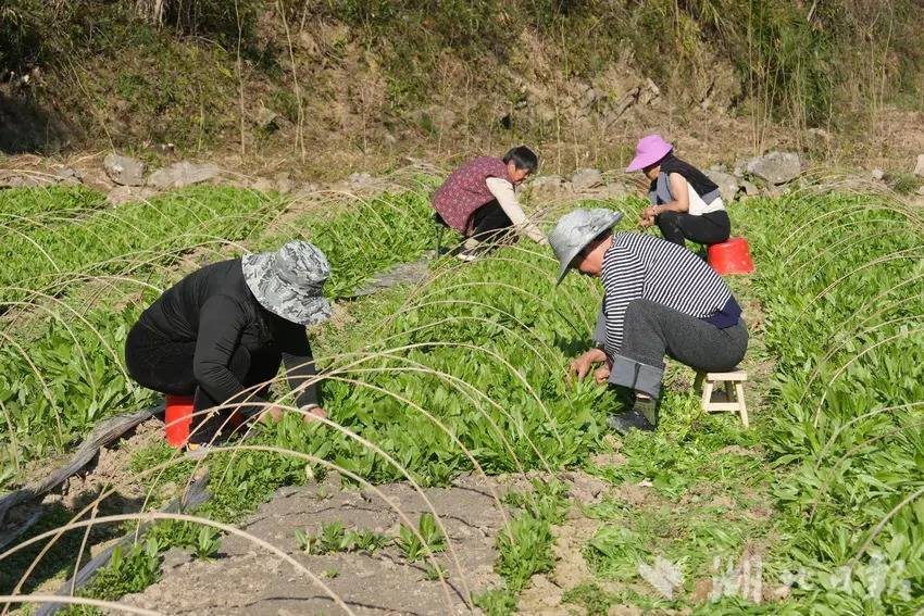 这片生机勃勃的贡菜田,是当地种植大户董传珍的希望田野,今年1月播种的300亩贡菜正值生长关键期,十余名村民正弯腰在田垄间忙碌,小心翼翼地拔出过密的幼苗进行“散苗”。据居民介绍,等过一两个星期待幼苗长到3-4片真叶时,便可移栽到整理好的大田里。