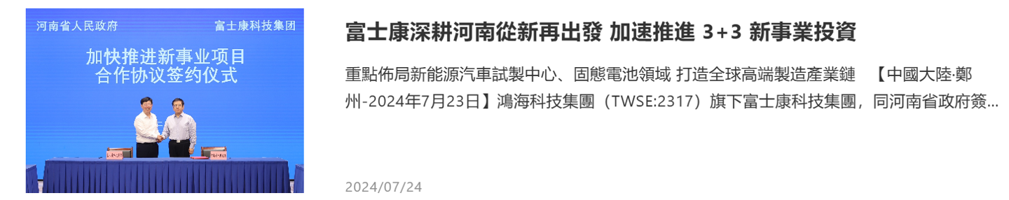 2024 年 7 月 23 日,鸿海子公司富士康科技集团同河南省政府签署《河南省政府与富士康科技集团加快推进新事业项目战略合作协议》。