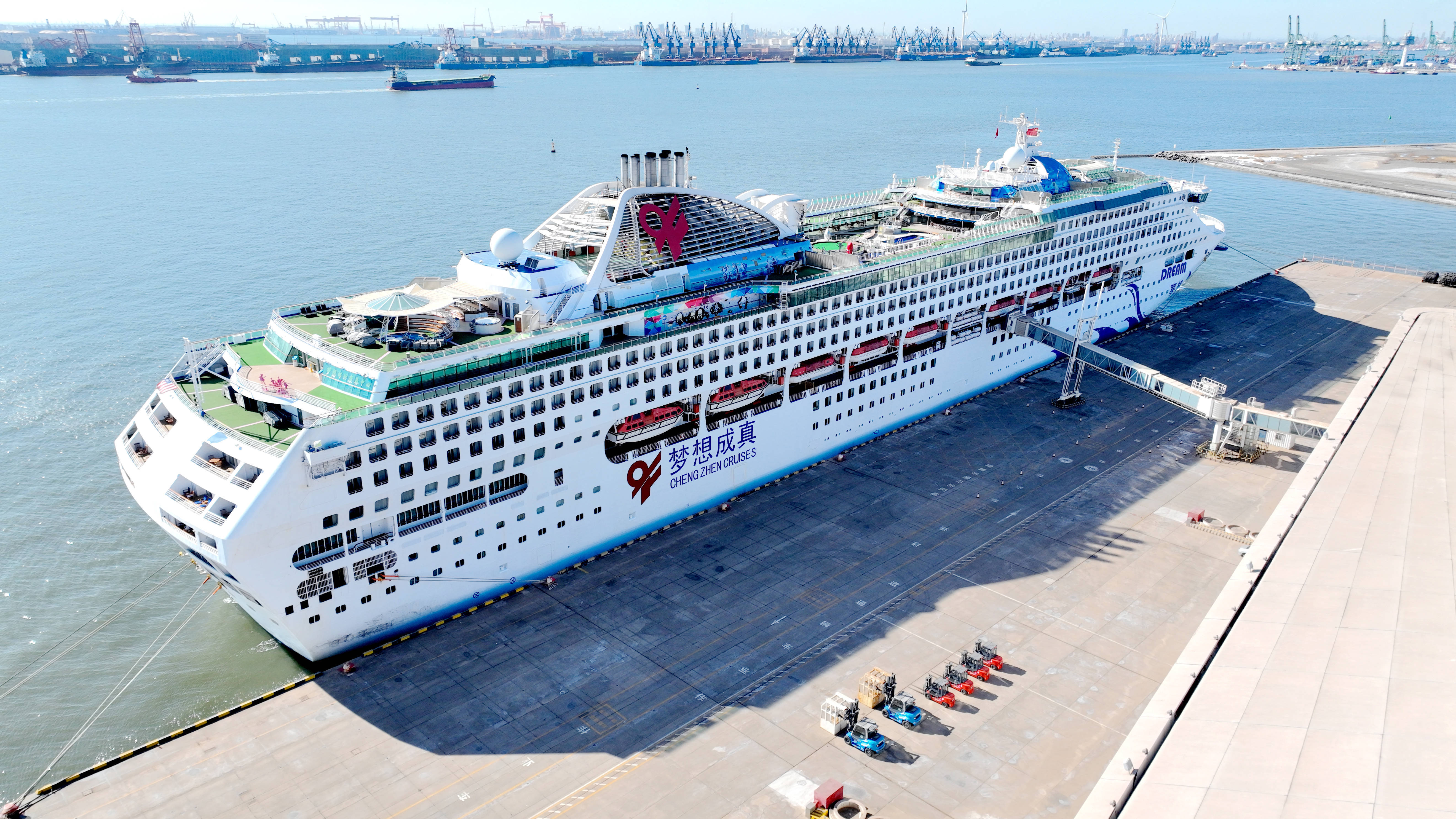 利比里亚籍“梦想”号邮轮靠泊天津国际邮轮母港。新华社发据悉,今年春运期间,预计将有约20艘次国际邮轮从天津出入境,预计出入境人员将超过3万人次。